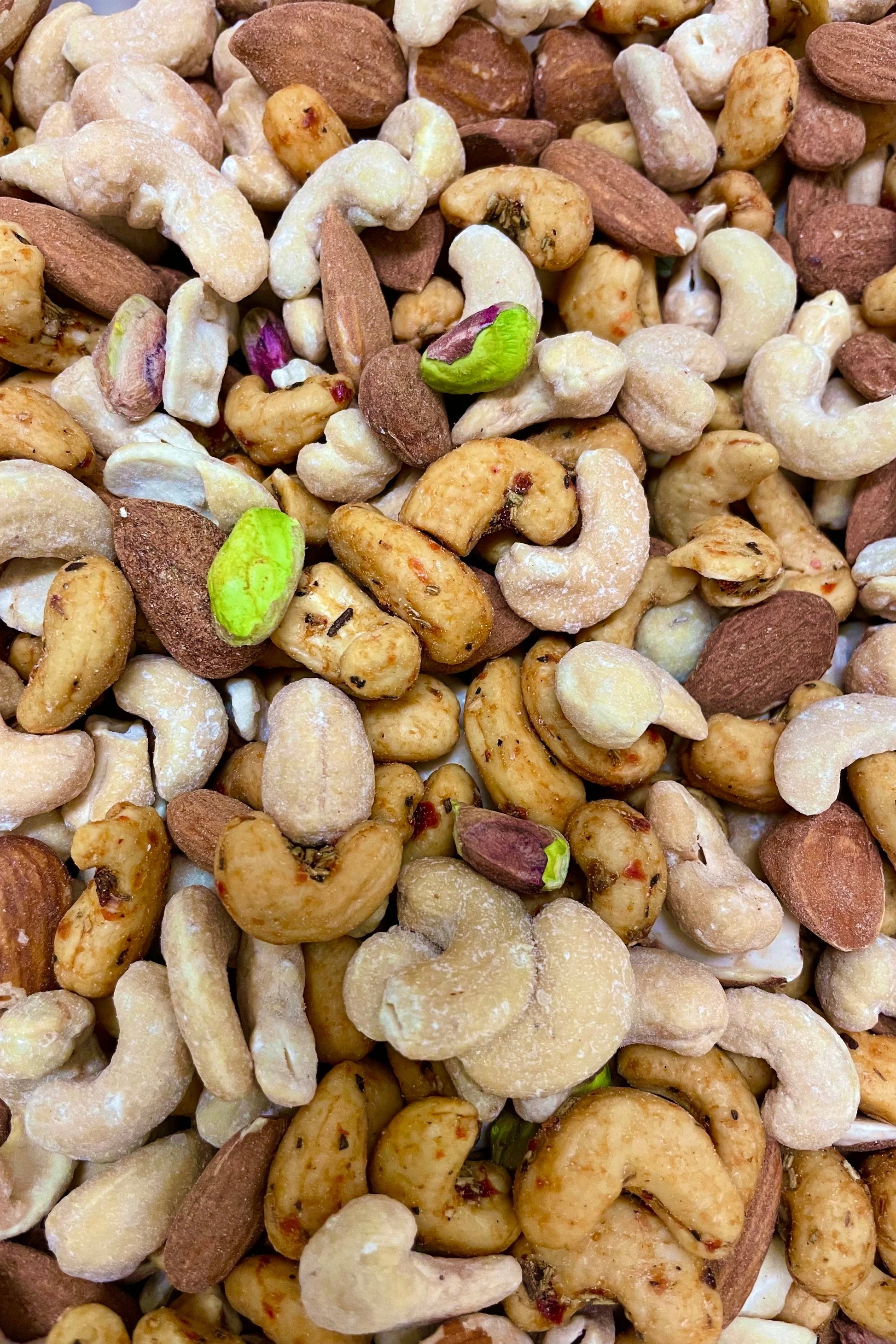 Cashewkerne geröstet mit Salz, Cashewkerne geröstet mit Rosmarin, Mandeln braun, Pistazien natur, Rosmarin, Paprikaflocken, Pfeffer, Gummiarabicum, Zucker, Salz
